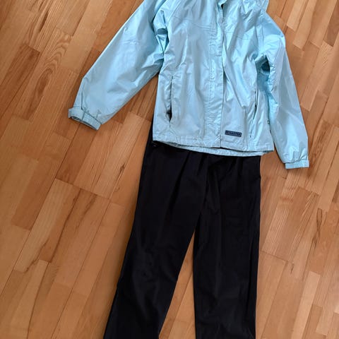 Let regnslag med hætte og lomme med lynlås på maven. Trykknaplukning (3 trykknapper) ved hals.