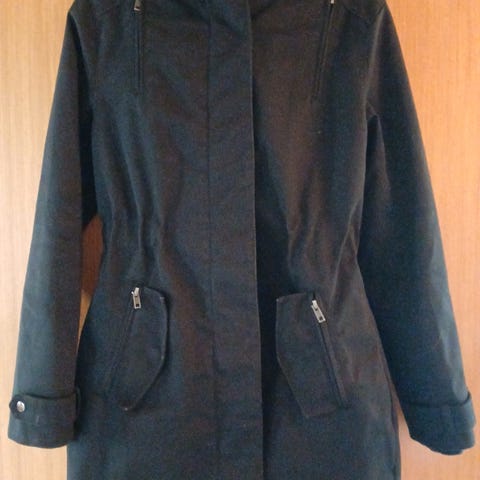 Frakke, str. 44, Samsø Samsø, Sort, Ubrugt, Flot vinter frakke, kraftig foret, 3/4 lang med hætte, lynlås og trykknapper. Yderlige er der 4 dejlige skjulte lommer, 2 brystlommer og 2 store med lynlåse. Længden på frakken er 100 cm.