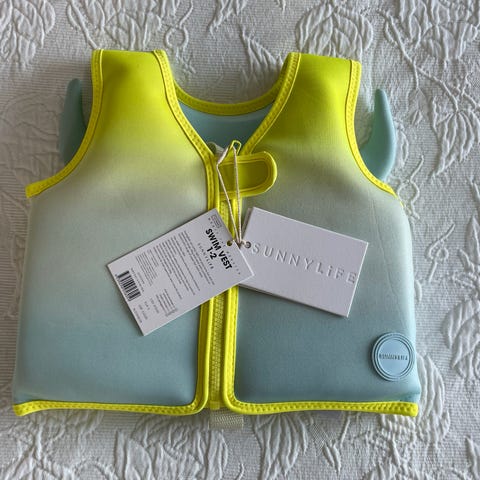 Helt ny & skøn smiley svømmevest fra Sunnylife. Den er i gul med blå smiley.