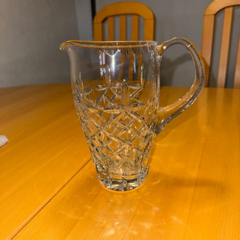 Stor krystal glas kande i kraftig kvalitet. 24cm høj. Med slibninger forneden. Købt for 30 år siden.