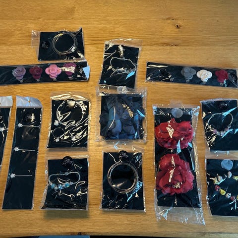 - hårsæt med hårpynt: hårbånd og 2 hårelastikker