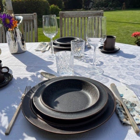 Stentøj, Spisestel og tre fade, Arabia Ruija, Klassisk finsk design fra 70,erne, formgivet af Ulla Procope´. Stellet er vintage, og i fin stand, er håndmalet, og er både ildfast og egnet til opvaskemaskine. Der er 10 middagstallerkener og 8 dybe tallerkener, 1 stort aflangt fad, et rundt fad og en stor dyb skål.