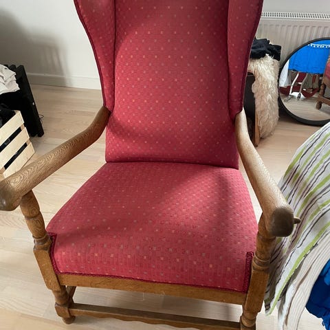 Øreklapstol, stof, Stor flot øreklapstol, Wing chair, lænestol fra 60’erne i stel af massiv eg. Flot og velholdt og rigtig god siddekomfort. Perfekt til herreværelset.