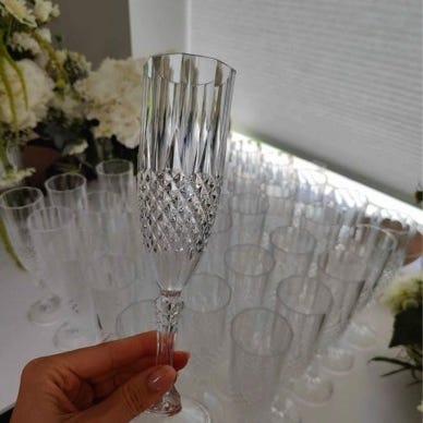 Meget fine champagneglas uden fod, sjov til f.eks. nytår, eller til en have fest eller studenter fest hvor de kan placeres i spand med sand. Glassene har aldrig været brugt, men kun stået til pynt.