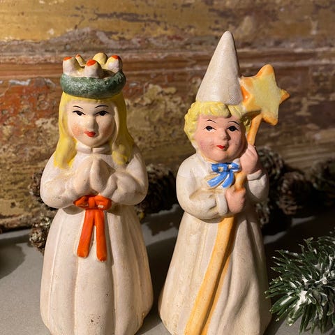 Stjernedreng Lucia, Skønne vintage jule figurer af træ. Dansk og svensk håndarbejde med søde ansigter og fine detaljer.