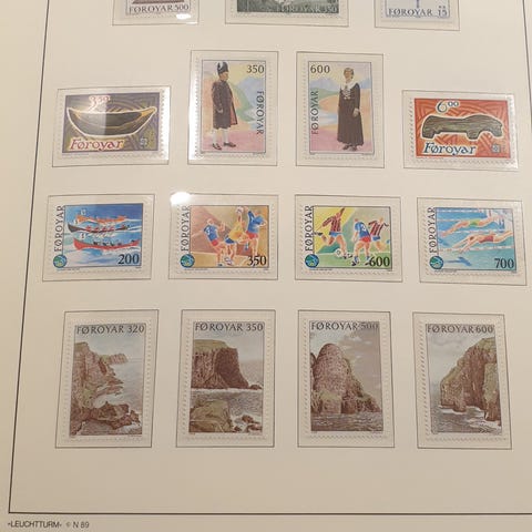 Færøerne, postfrisk, Øvre marginaler, Komplet samling af øvre marginaler fra Ø0001 til FR317 samt dubletter af flere af Ø numrene. I alt 22 dubletter. De er 100% postfriske og uden folder. Sidder på fortrykssider fra Leuchtturm i Leuchtturm bind med kassette, som kan tilkøbes for 300 kr. Pålydende værdi er 5450 kr.