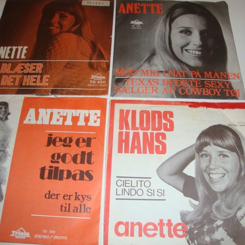 LP, ANETTE., 4 LPèr med Anette (Blegvad), Pop, Hun havde et fantastisk pop-liv.. Hedder egentlig Bente Carlsen. Men kom med i Henning Blegvad orkester ( som hun senere blev gift med) som egentlig havde en sangerinde der hed Anette med som stoppede og så kom Bente med i stedet og kom til at hedde Anette. Hun lavede nogle kæmpehits som Min student fra Upsala, Texas bedste sexy sælger af cowboy tøj, Mr. Rockefeller, Mød mig i nat på månen, Cielito Lindo og mange flere. samlet pris 60 kr.