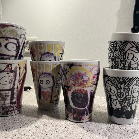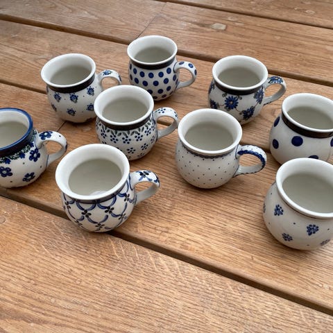 Porcelæn, kaffekrus, ARABIA, ARABIA 100 års jubilæums kaffekrus og tallerken med brun dekoration fra 1973. ARABIA serie Mug, designmønster Esteri Tomula. Form Kai Frank. Meget sjældent samlerobjekt. 7 krus og 8 tallerkener. 2 krus har små afslag og tallerkenerne har meget små glasurujævnheder. Sælges helst samlet. Krus diameter 8,7cm, højde 7,5cm, tallerken 14,5cm. (lot 2728)