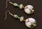 Øreringe med håndlavet glasperler med fugle motiv og små grønne jade sten.