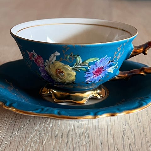 Porcelæn, Kop med underkop, Gammel mokkakop i flot solgul.