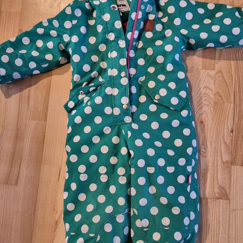 Flyverdragt, Bifrost by Danefae, str. 86, To lynlåse der praktiskt lyner langt ned. Kun én fodstrop, der dog er meget spændstig, men kun kan justeres et hak i begge sider. Lille i str. Da barnet var 84cm begyndte den at sidde meget til når hun kravlede rundt i den.