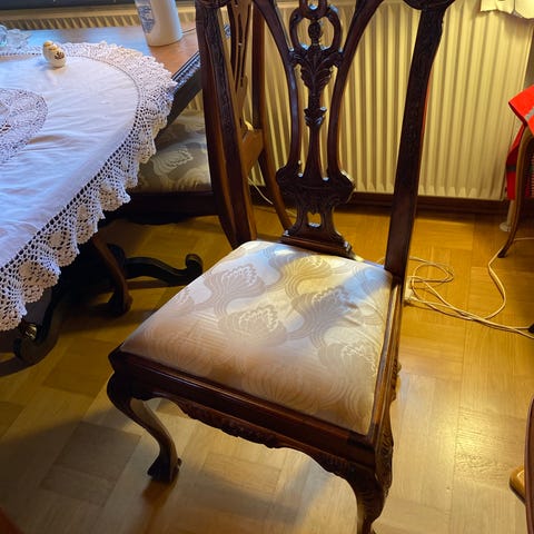 Meget flotte stole i original stand med håndudskårne ben og ryg- den ene skal dog repareres (se billede af skade - ikke forsøgt repareret), derfor den billige pris