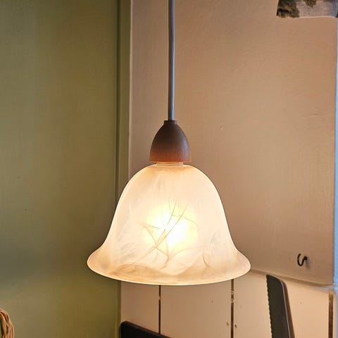 LAMPE. Tre glaslamper / ampler samlet. Meget kraftigt rustikt glas med messingtop og fatning. E meget hyggelige med lys i. Højde 9cm / 13 cm med top. Diameter 15 cm. Vejer 560g pr. stk, i alt 1680g.