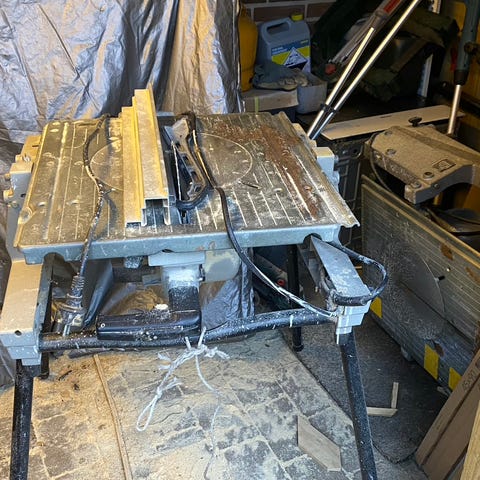 Værktøj, Vintage rundsav, Denne sav har nok stået i vores hus, siden det blev bygget. Områdets børn gik til sløjd i vores udhus for 75 år siden og dengang stod den samme rundsav her (siger en af landsbyens ældre, som gik til sløjd her som barn. Vores hus nærmer sig de 100 år. Jeg ved ikke andet om den, end det, jeg har fået at vide. Burde måske stå på et museum