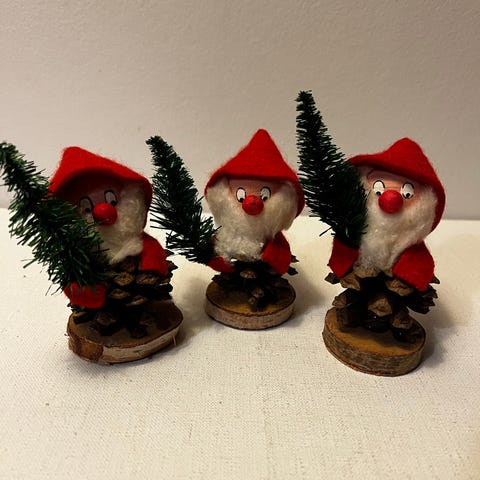 Koglenisser - retro, 1 par siddende retro koglenisser / kogle nisser, store, ca. mål:: H31 cm, L20 cm, i god stand. Fra et røg- og dyrefrit hjem.