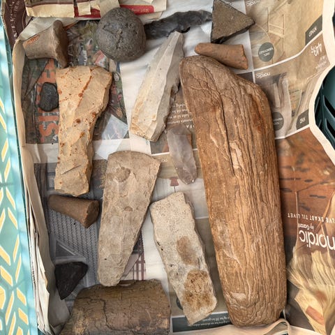 Specielt store stenøkser, flintedolke, huløkser, offerøkser, kæmpe flækker, segl, hele krukker og stridsøkser har interesse.