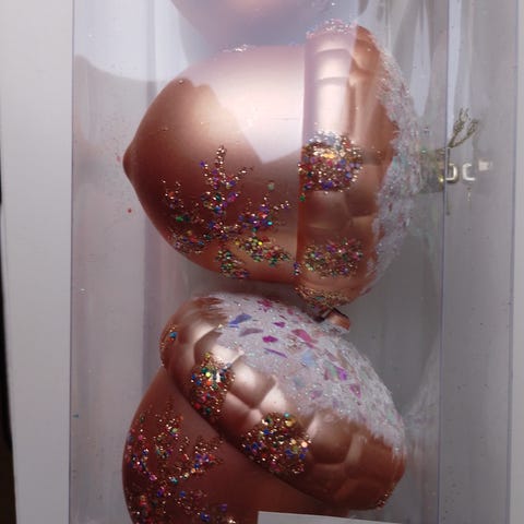 Stor naturkogle m/små naturkogler, sløjfe samt kunstig gran og bær med snor til ophængning L12 cm, B8 cm. Pris 20 kr.