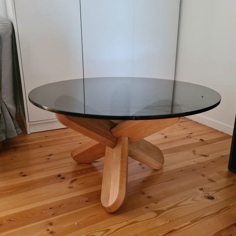 Glasbord, b: 80 l: 140 h: 48, Vintage sofabord - malet træstel, glasplade. Hylde.