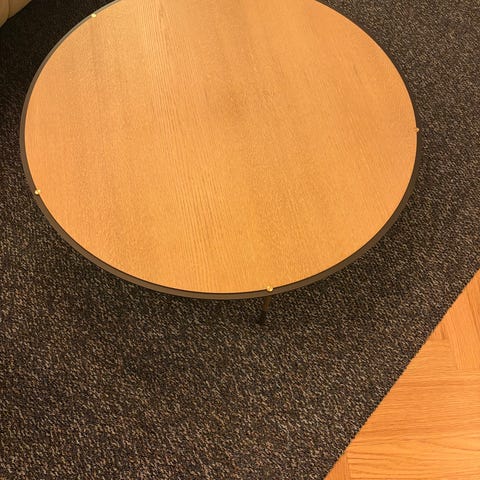 Fotos viser bordet med alternative runde, sortmalede træben, men de originale ben på kun 2,5cm højde, udført af rustfrit stål i matt-satin finish med sorte PVC skiver mod gulv medfølger også.