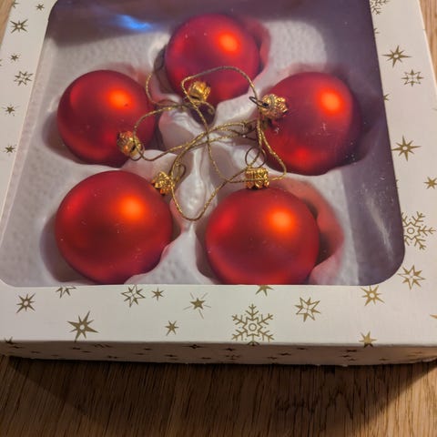 Ældre røde jule kugler, 8 stk som er sat sammen i rødt silkebånd. Kan have almindelig brugsspor.