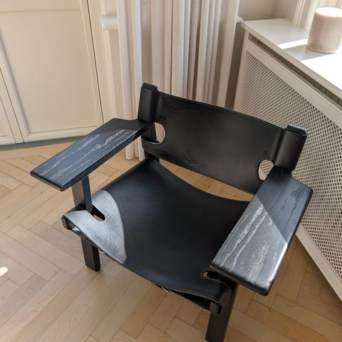 Børge Mogensen, Tidlig udgave af BM2226, Lænestol, Gammel udgave af Den Spanske Stol med to tvær sprosser, i velholdt og flot patineret stand.