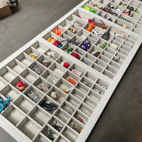 Samlefigurer, Gammel sættekasse 30x80 cm. Diverse nips til at sætte i medfølger. Kommer fra ikke ryger hjem.