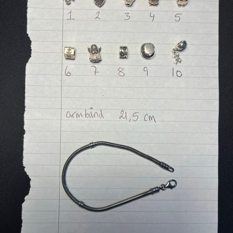 Der er 5 charms i ægte sølv med smukke zirkonia.I Hjerte charmset i midten af armbåndet er yderligere et lille guld hjerte.Der er også 2 runde stopper med zirkonia som også bruges som charms. Sælges med tilhørende æske.