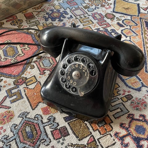 Vintage telefon i sort farve. Klassisk design med drejeskive og kabel. Velegnet til samlere eller som retro dekoration i hjemmet.