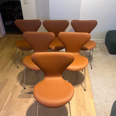 Arne Jacobsen, stol, 3107, Den klassiske 7er stol fra Arne Jacobsen. Model 3107 er ny polsteret af professionel møbel polstre med nyt skum og læder. Stolene er polsteret i sort semi anilin. Læderet har fået en overflade behandling så den tåler, hverdagens brug. Original sidde højde på 46,5 cm. Der er to års garanti på polstringen. Mulighed for køb 2-4-6-8 stk.