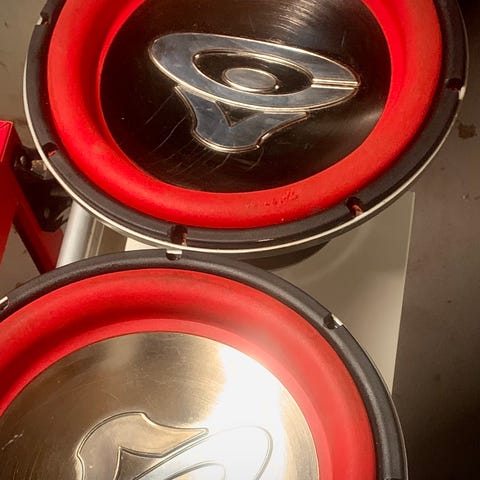 andet mærke Cerwin Vega 104, Subwoofer, Kun lidt brugt - lille revne i rød gummimembran (se billede), kan lappes - prisen er sat så lavt af samme grund.