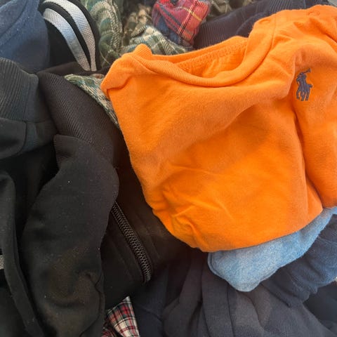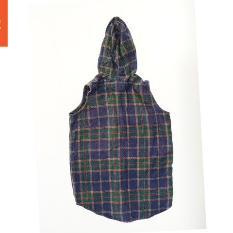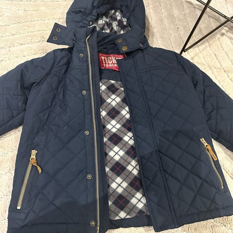 Mørkeblå vest m. hætte og fleecefor, lynlås og knaplukning, jeans, lyseblå langærmet T-shirt m. tryk.