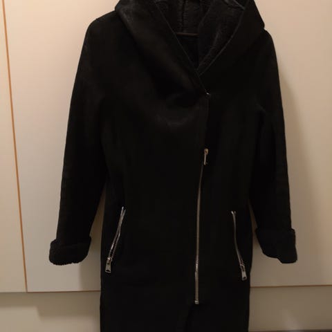 Brugt Sort lammeskinds frakke str. L (40).