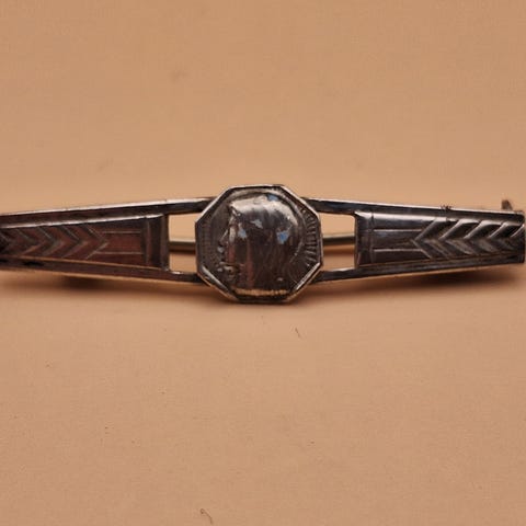 Brochen er formentlig fra omkring århundredskiftet og er lavet i victoriansk stil. Brochen måler ca. 4,5cm.