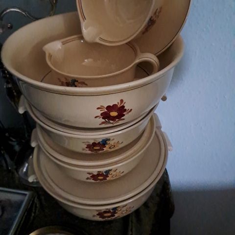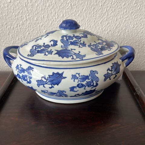Porcelæn, HÅNDMALET TERRIN OG FAD, Her sælges et fint sæt bestående af serveringsskål med låg (terrin) samt ovalt fad - begge med samme sirlige, håndmalet dekorationsmønster i blå blomster. Terrinen virker lidt mere blåfarvet i nuancen end fadet, men de er helt sikkert lavet som sæt. I den ene bund står der Cecilie. Mål ca. 25 x 18,5 cm.