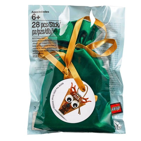 LEGO Christmas Tree Ornament i grøn satinpose.