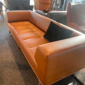 Sofa, læder, 3 pers. , Erik Jørgensen, model Delphi 3 pers. sofa 240x85x66/37 cm Polstring: Cava cognac læder Stelvariant: Slebet aluminium Design: Hannes Wettstein Leveret November 2020. Som det kan ses på billedet står sofaen som ny, den er meget lidt brugt og der medfølger en rygpude. Rygpude model 450-E21 Str.: 60 x 38cm Polstring: Cava cognac læder