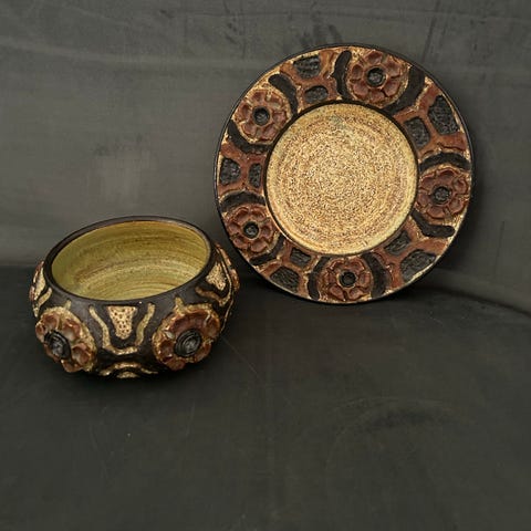 Jette Hellerøe, keramikfad med flæser motiv: jordfarver