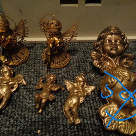 Guld engle, 8 guld engle. Af ældre dato. De kan både ligge og hænge. Højde 9 cm. Længde 8,5 cm. Pris pr stk 40 kr. Se også mine andre annoncer. Hv123