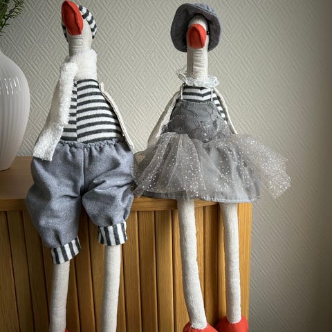 Hr. og Fru Moose, Hæklede elge efter opskrift fra Krea de Luxe men med egne justeringer. Længde ca 45 cm. Tøj kan tages af og de tåler vask på 40 grader. Hr. og Fru Moose var "Årets hæklede julefigurer 2019". Kit koster 499 kr