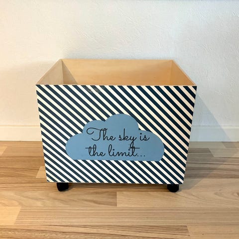 Opbevaring, Opbevaringskasser på hjul, 2x Trækasser på hjul med skrå striber og blå skyer på forsiden. Bagsiden er kun stribet.