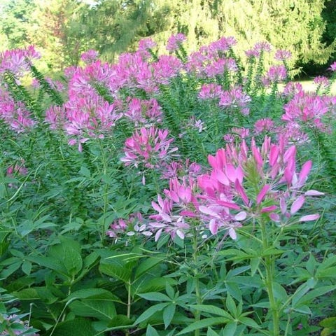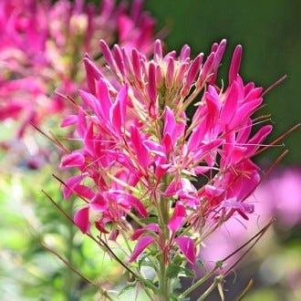 Meget smuk violet edderkoppeplante, der kræver meget lidt pleje når den først er etableret. Dette gør den perfekt til bagkanter eller områder, der er svære at vedligeholde. Lang blomstring, for nye knopper fortsætter med at dannes og åbne sig fra midten, efterhånden som gamle kronblade falder. Hjortebestandig og bestøvervenlig, den er også en god afskårne blomst - pas bare på de små torne på stilkene. Selvsåer let. 90-120 cm højde.