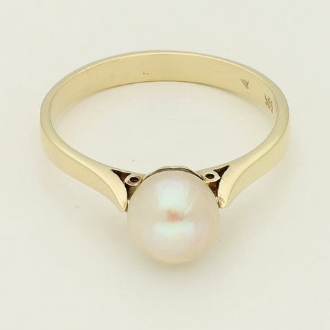Virkeligt smuk guld ring i 14 karat, fra Per Borup, med fine blade der snor sig om fingeren, og ægte ferskvandsperle.