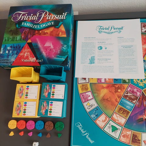 Trivial Pursuit, Familiespil, brætspil, Brugt en del, men i pæn stand, dog har æsken slidtage. Spørgsmål i 6 kategorier. Alder: 15 år Spillere: 2-36 personer. Ann. nr. G15