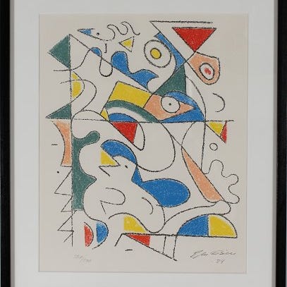 Komposition , Ejler Bille, motiv: Vejlby strand, b: 57 h: 62, Smuk komposition af Ejler Bille fra 1965 i Original indramning. Se beskrivelsen under fotos.