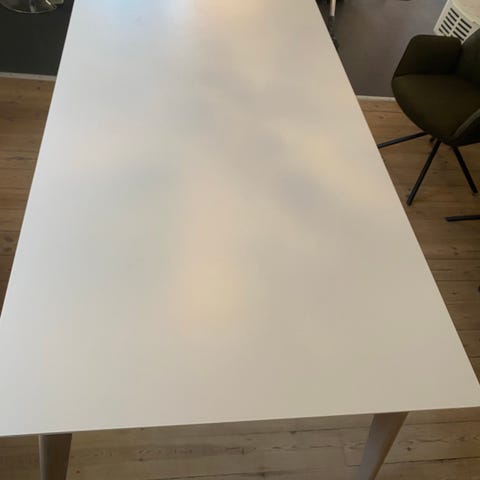 Spisebord, b: 90 l: 180, Jeg sælger det her fine spisebord. Selve bordpladen er hvid, og har stålben. Vi har haft bordbeskytter på, siden vi fik bordet, så bordet er helt hvidt og rent. Man kan fjerne bordbeskytteren hvis man vil det.