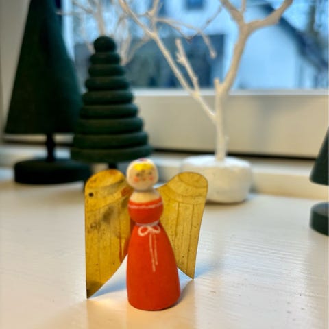 Træengel, Fineste juleengel af træ med trompet og vinger af gylden messing. Yndigt ansigt og flot udformning.