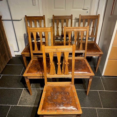 Spisebordsstole, 8 antikke stole i enkelt, klassisk dansk design, tror det er nøddetræ, mahogni eller teaktræ. De er pæne men har brugsspor, kan nemt ombetrækkes.
