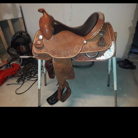Den sælges inkl. læder latigo og off billet, samt 32” sinch/gjord i filtet uld fra Weaver. Jeg har også 2 nylon latigos jeg skal af med, hvis man vil have dem med i købet.