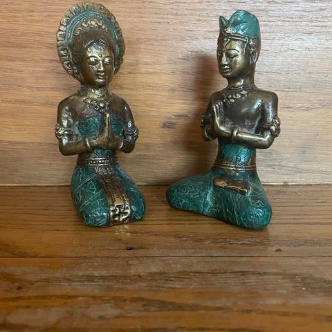 Figur, Buddhistiske figurer. Den store måler ca 24,5 x 17,5 cm (har et lille hak i hovedet, se billeder) og de små ca 15,5 x 10 cm. Lavet og håndmalet i Thailand. Materialet er noget let træ - det er det nærmeste jeg kan komme på det. Sælges samlet for 300 kr