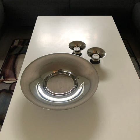 eb Erik Bagger, Flot fad i poleret stål samt to lysestager til fyrfadslys eller LED-lys. Velholdt med yderst få brugstegn. Fine også på glasbord, da de ikke ridser eller til den kommende trend med 80'erne i indretning.